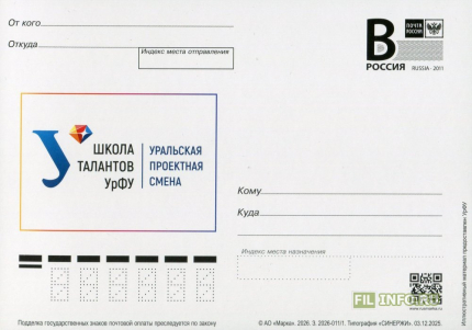 Страна: Россия Год: 2026 Вид коллекционирования: ПК с литерой B Каталог ИТЦ: 011 Дата добавления: 07.04.2026 |